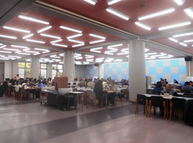 同時期に、8つの科目のスクーリングがそれぞれの教室で開催されており、休憩時間の食堂やトイレは50~70代の中高年であふれた。