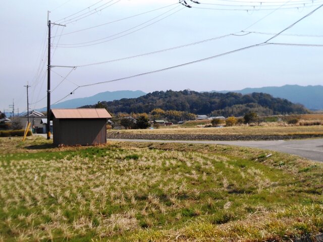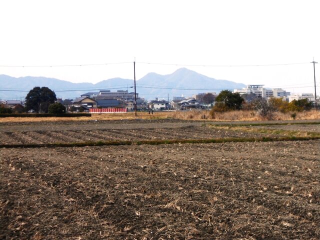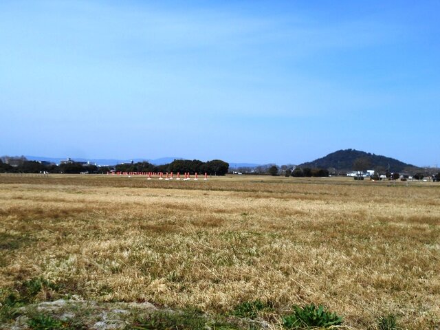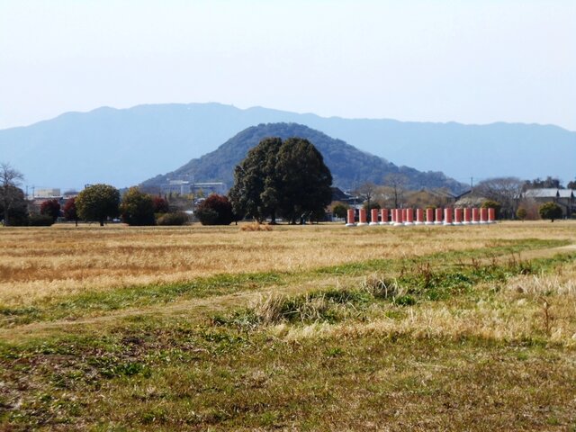 藤原宮の東を守る畝傍山(うねびやま)と大極殿跡