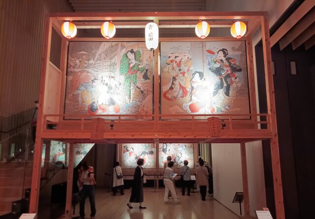祭りの夜にはこのような山門風の絵馬台に屏風絵か飾られ、道に並べられる