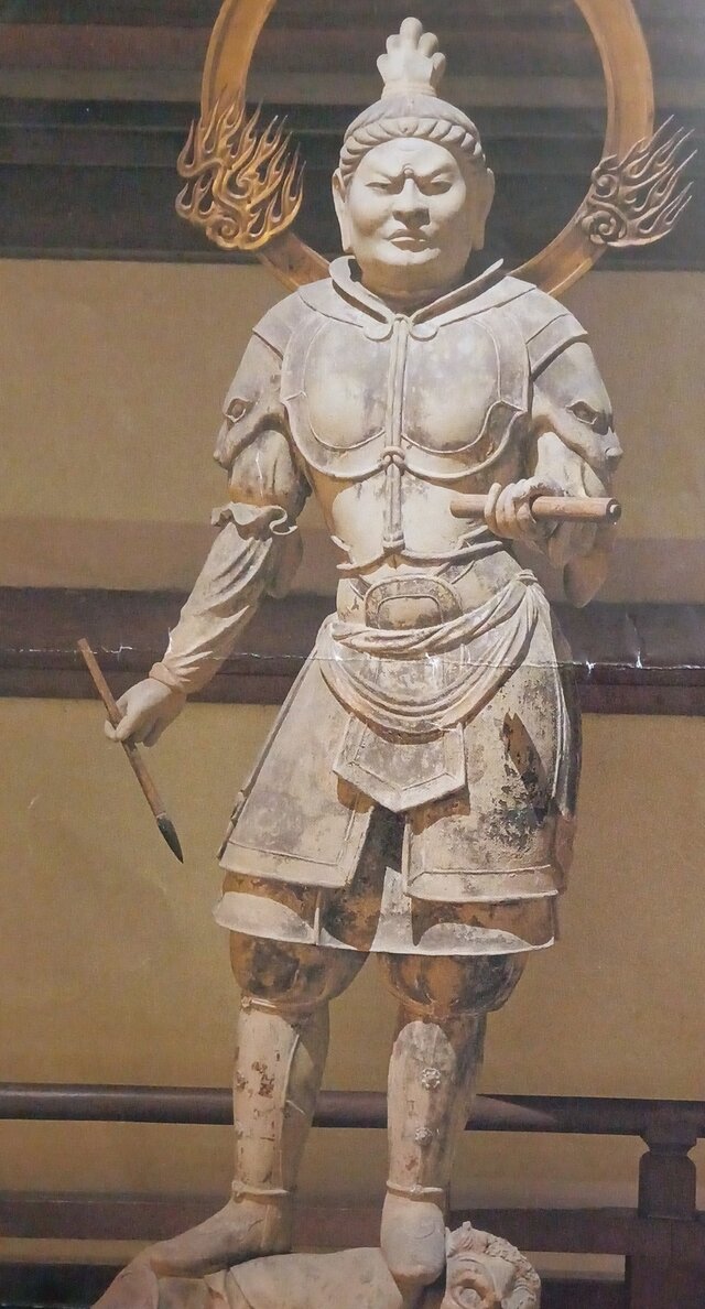 広目天は、国宝指定されている法隆寺金堂や東大寺戒壇堂の像に見られるように、筆と巻物を持っていることが多い。憤怒の表情と文系アイテムのギャップが面白い。
