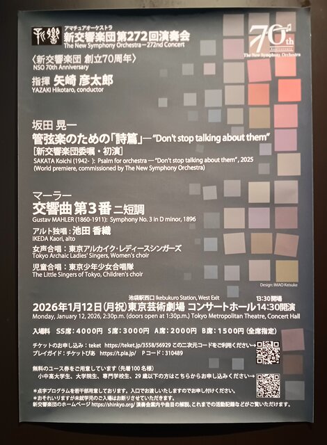 それもこれも、今回の前プロが坂田晃一作曲『管弦楽のための「詩篇」』であったがゆえに、曲が終わった際に指揮の矢崎がチェロパートの先頭にいた坂田を観客に紹介したがゆえに、知った事実である。