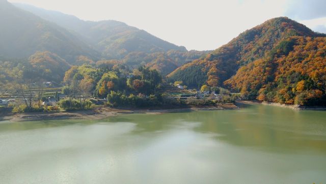 紅葉に縁取られた内場湖の神秘的な深い緑が待っていた。