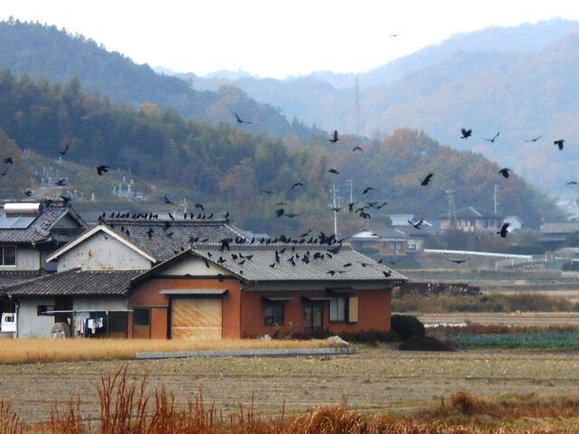 畑中の家にカラスがしきりにたかり騒いでいた