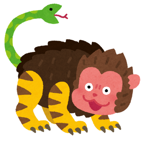 一方、こちらの鵺は、頭が猿、胴体がタヌキ、手足が虎、尾っぽが蛇というキメラ型怪物。