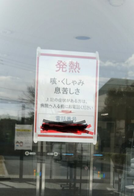 熱や咳症状のある来院者への注意書きが、正面入口に貼られた。
